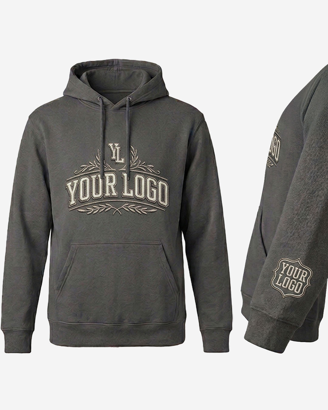 Custom logo embroidery available for hoodies, sweatshirts, and staff apparel.