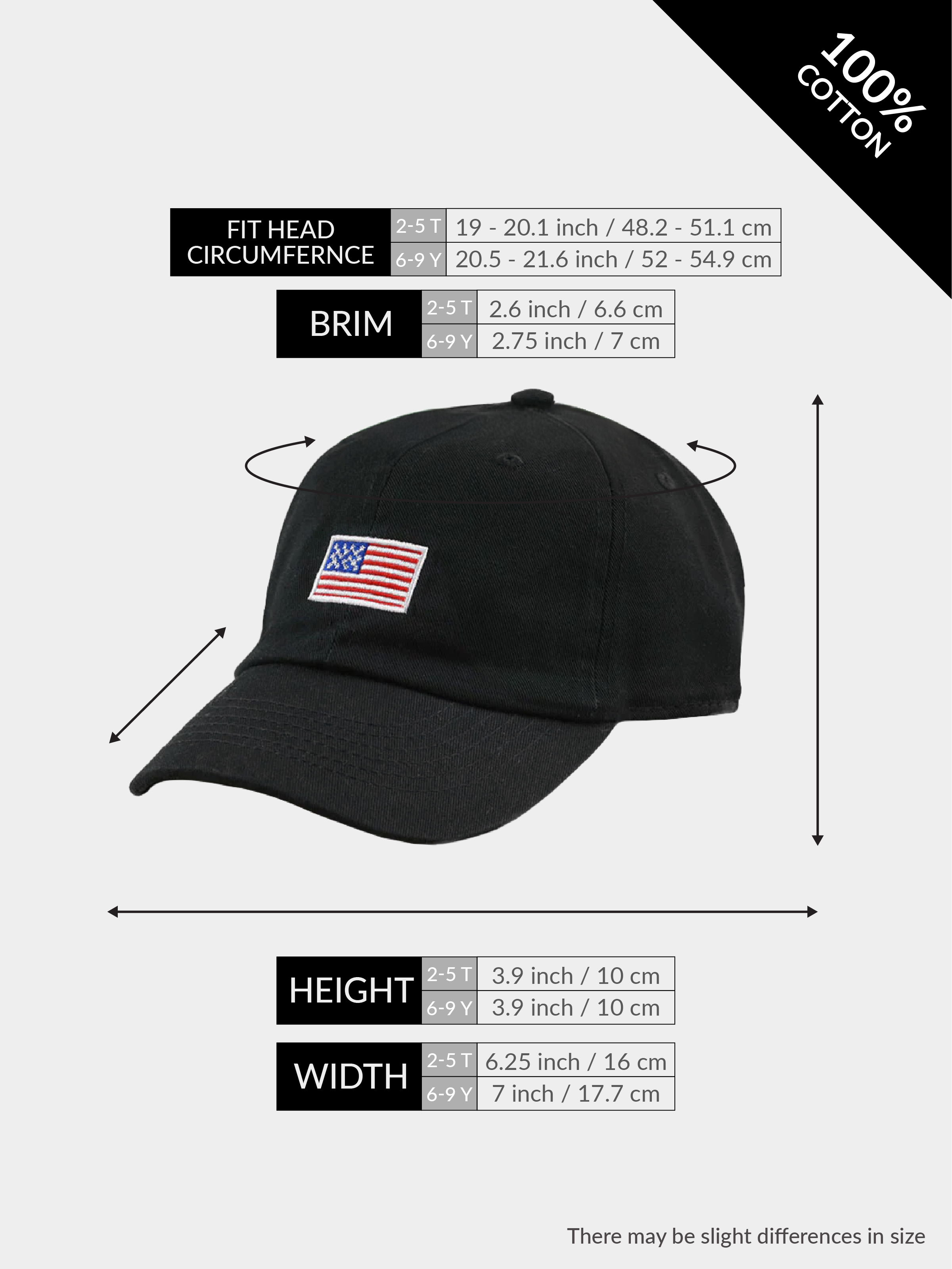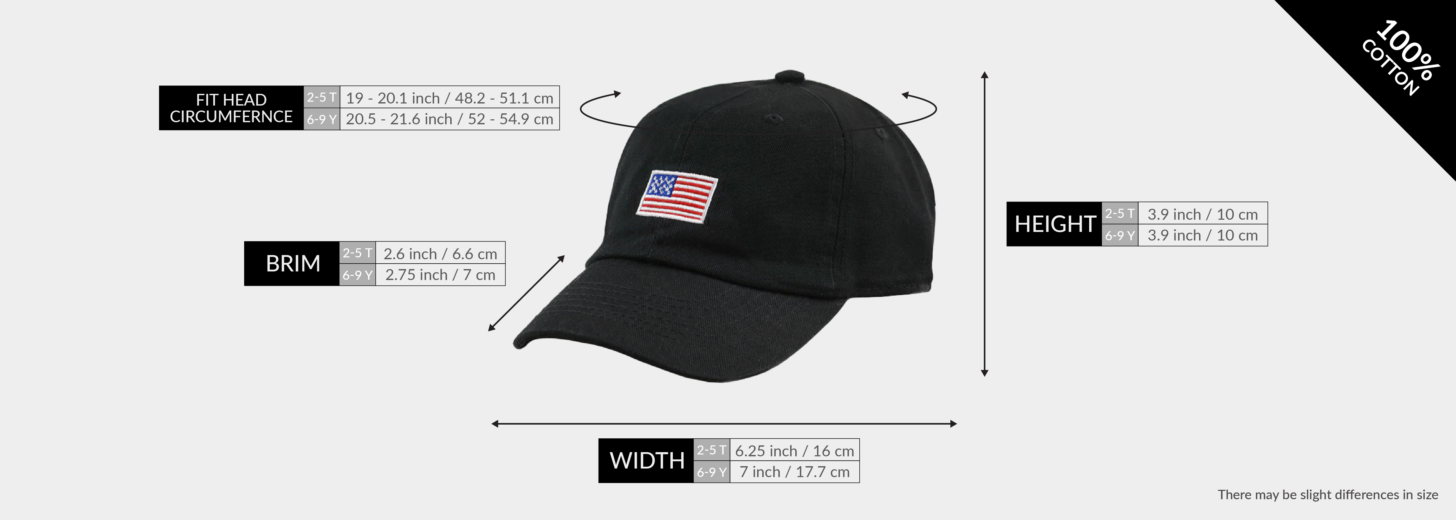 - One size fit most, there is adjustable buckle. Usually fit for 2-5yrs- 3.5" Crown, 2.5" Curved seamed bill